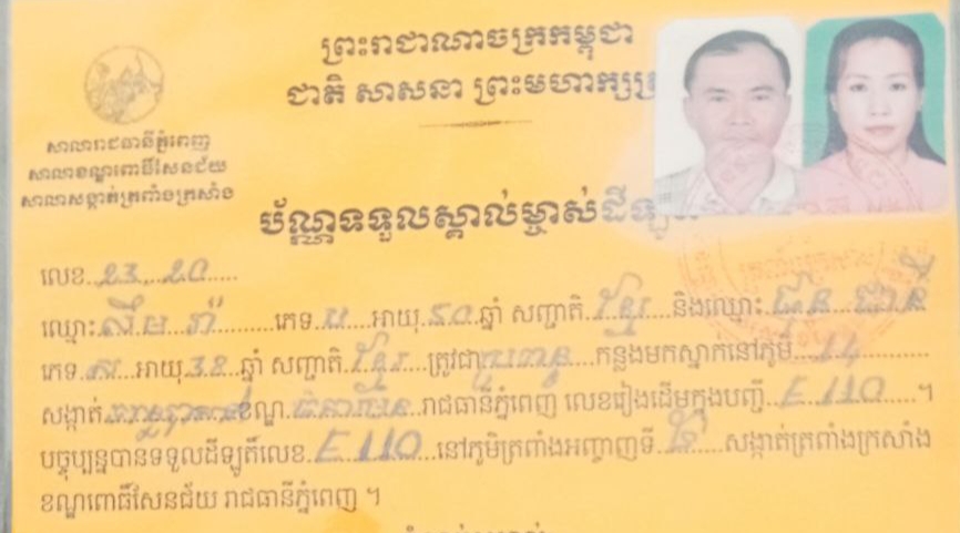 ខ្ញុំបាទឈ្មោះ លឹម រ៉ា, ភេទប្រុស អាយុ ៥៥ឆ្នាំ សញ្ជាតិខ្មែរ អត្តសញ្ញាណបណ្ណលេខ ០១០៨៥៥១៤១, មានទីលំនៅ ភូមិត្រពាំងអញ្ចាញប្រាំ សង្កាត់ត្រពាំងក្រសាំង ខណ្ឌពោធិ៍សែនជ័យ រាជធានីភ្នំពេញ។ប្រពន្ធខ្ញុំឈ្មោះ ផុន ផានី, ភេទស្រី អាយុ ៤៣ឆ្នាំ សញ្ជាតិខ្មែរ មានទីលំនៅដូចខាងលើ។